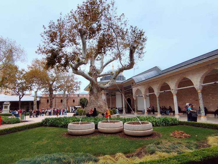 A palota udvaraiból sétálva mindig újabb részlet bukkan elő: aprólékosan faragott kapuk, márvány szökőkutak, színes csempék és aranyozott kupolák. A negyedik udvar pavilonjai különösen szépek – innen tárul fel a Boszporusz, az Aranyszarv-öböl és a Márvány-tenger panorámája.