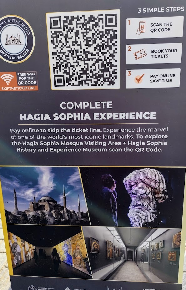 Sajnos 2024 óta a nem muszlim hívők csak a Hagia Sophia felső múzeumi szintjét látogathatják, belépődíj ellenében. A tér felől megközelíthető földszinti részt kizárólag muszlimok és török állampolgárok számára látogatható ingyenesen. A turisták új bejárata a Hagia Sophia jobb oldalán a Topkapi palota felőli oldalon található.