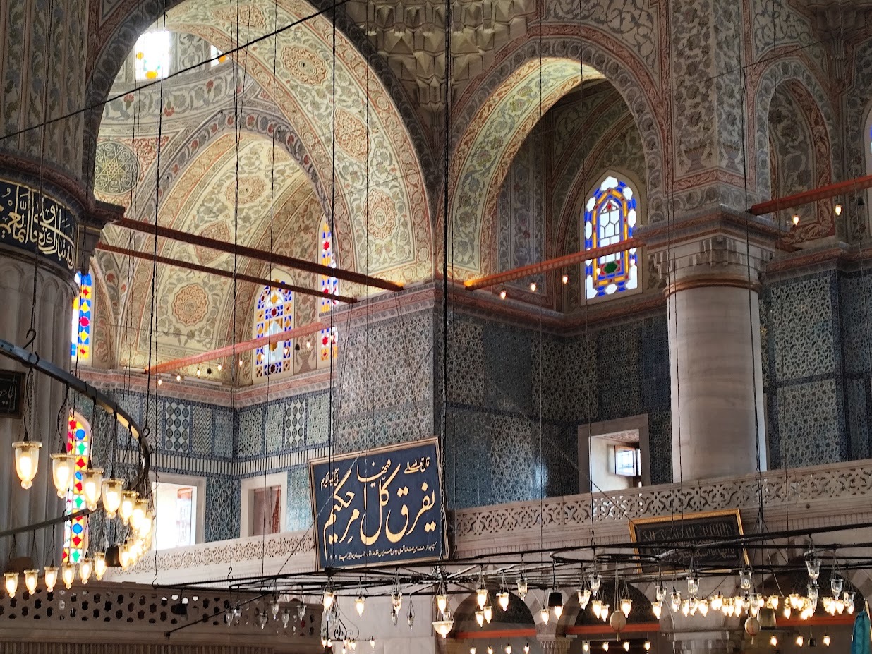 A Kék mecset különlegessége, hogy hat minarettel rendelkezik – ilyenből egész Törökországban mindössze néhány található. Ez a kiváltság a szultán tekintélyét is hangsúlyozta. A belső tér igazi mestermű: 21 ezer kézzel festett izniki csempe, 260 díszes ablak és elegáns mozaikok díszítik a falakat, amelyekről a napfény kékes árnyalatban verődik vissza – innen ered a mecset neve is, bár a legutolsó felújításnál a jellegzetes kék csempék jó részét bézses- mintás újabbakra cserélték.